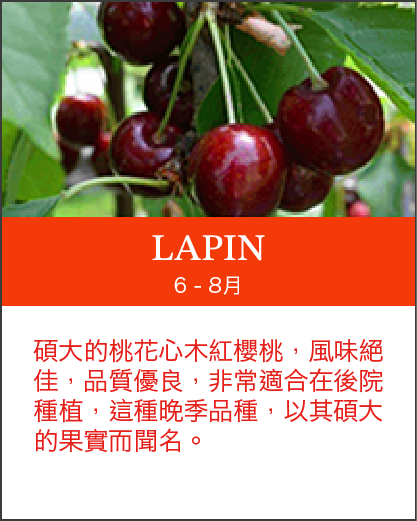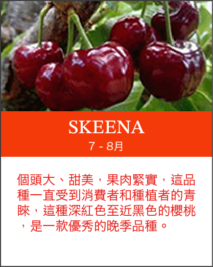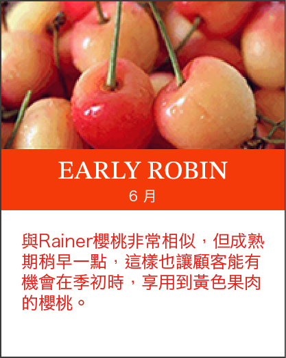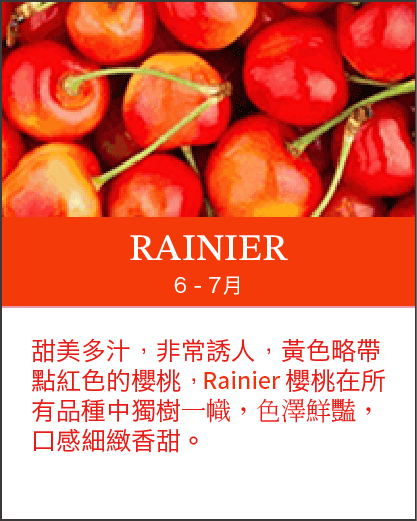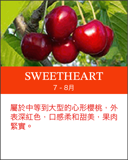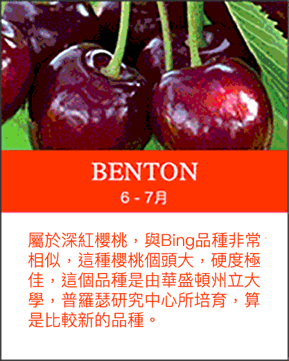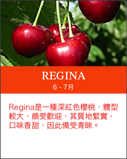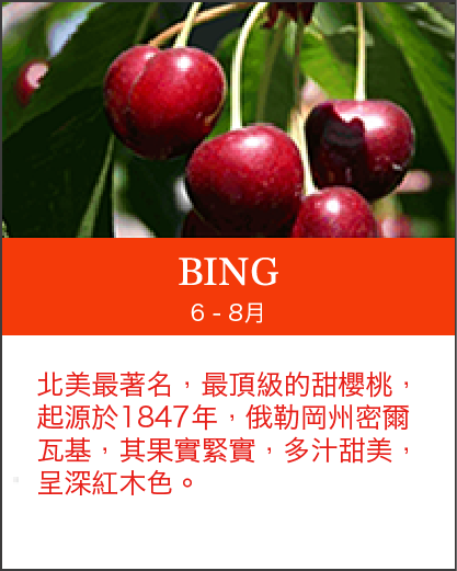 北美洲櫻桃產期:美國加州5至6月,華盛頓6月至9月,加拿大9月。